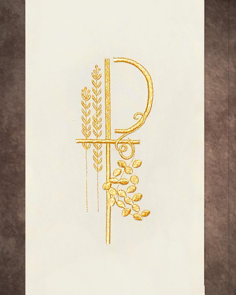 Stola weiß, mit maschinengestickter Symbolik, Ähren & Trauben sowie einem Nackenkreuz, feinfädiger Paramentenstoff (100 % Polyester), Konfektion im Faconschnitt, 130 cm lang und 16 cm breit.
