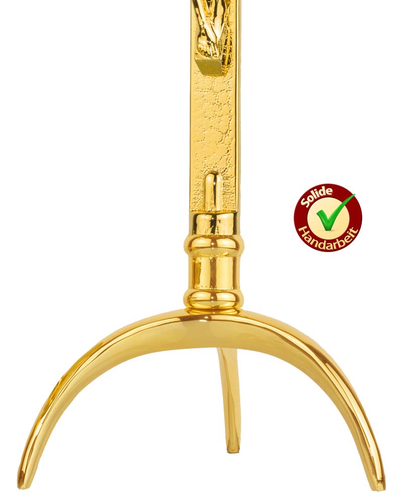 Altarkreuz aus Messing, dreibeinig, Höhe 42 cm, Breite 16 cm, mit polierter Oberfläche für den Einsatz auf Altar oder Kredenz. Das Kreuz zeigt einen detailliert gearbeiteten Corpus Christi und steht stabil auf einem dreifüßigen Standfuß. Gefertigt aus massivem Messing, geeignet für den dauerhaften liturgischen Gebrauch. Die glatte, goldfarbene Oberfläche ist pflegeleicht und widerstandsfähig. Das Altarkreuz dient als zentrales Zeichen der Eucharistiefeier und ist in Form und Proportion auf eine klare Sichtbarkeit im Altarraum ausgelegt.