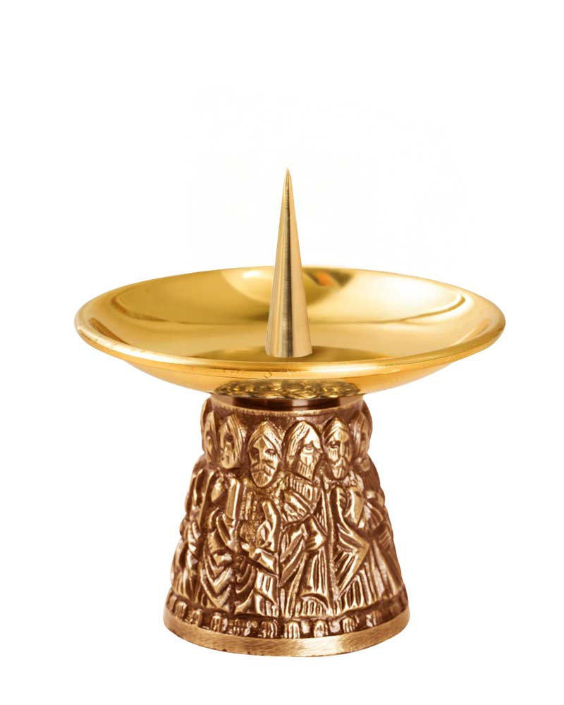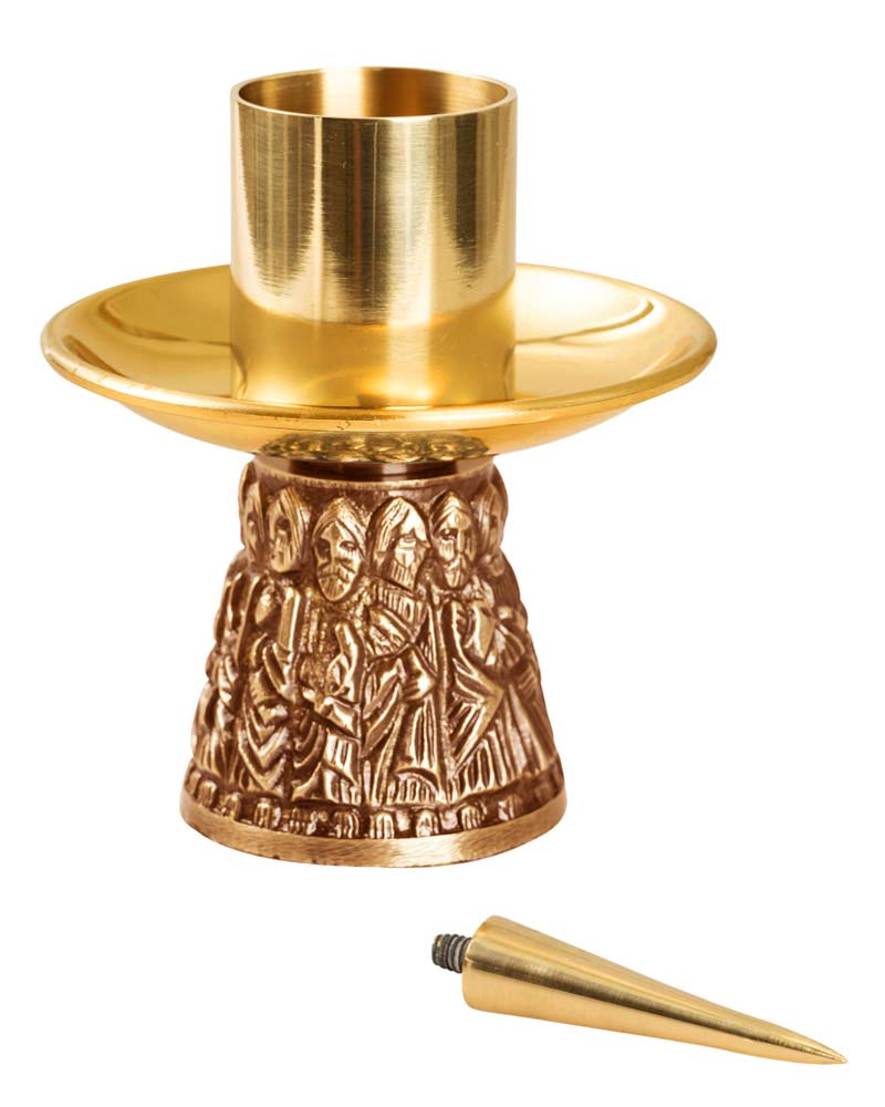 Altarkerzenhalter aus Messing, geeignet für die Feier der Heiligen Messe. Höhe 7,5 cm, Durchmesser 10,5 cm, passend für Altarkerzen mit Ø 4 cm. Der Kerzenteller mit Dorn sorgt für sicheren Halt und sauberen Abbrand. Der Fuß zeigt ein umlaufendes Relief der zwölf Apostel und verweist auf die apostolische Tradition. Lieferung inklusive austauschbarer Tülle und Dorn. Der Kerzenleuchter eignet sich für Altar, Kapelle und Sakristei.