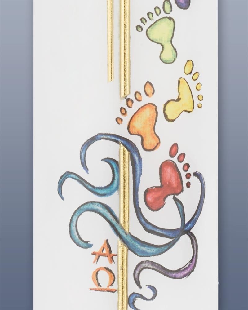 Die Kerze 265 x 50 mm ziert ein goldenes Kreuz mit einem Glasstein in der Mitte. Bunte Fußabdrücke wandeln hinaus, untermalt von Wassersymbolik und A+O. Hochwertige Kerzen aus deutschen Werkstätten mit RAL Zertifikat.
