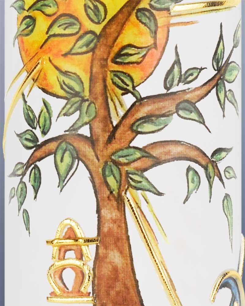 Die Kerze 265 x 60 mm ziert ein gemaltes Lebensbaummotiv mit goldenen akzentuierten Wachsauflagen. Mit zarten Details wie Wasser Baum, Sonne und A + O. Hochwertige Kerzen aus deutschen Werkstätten mit RAL Zertifikat.