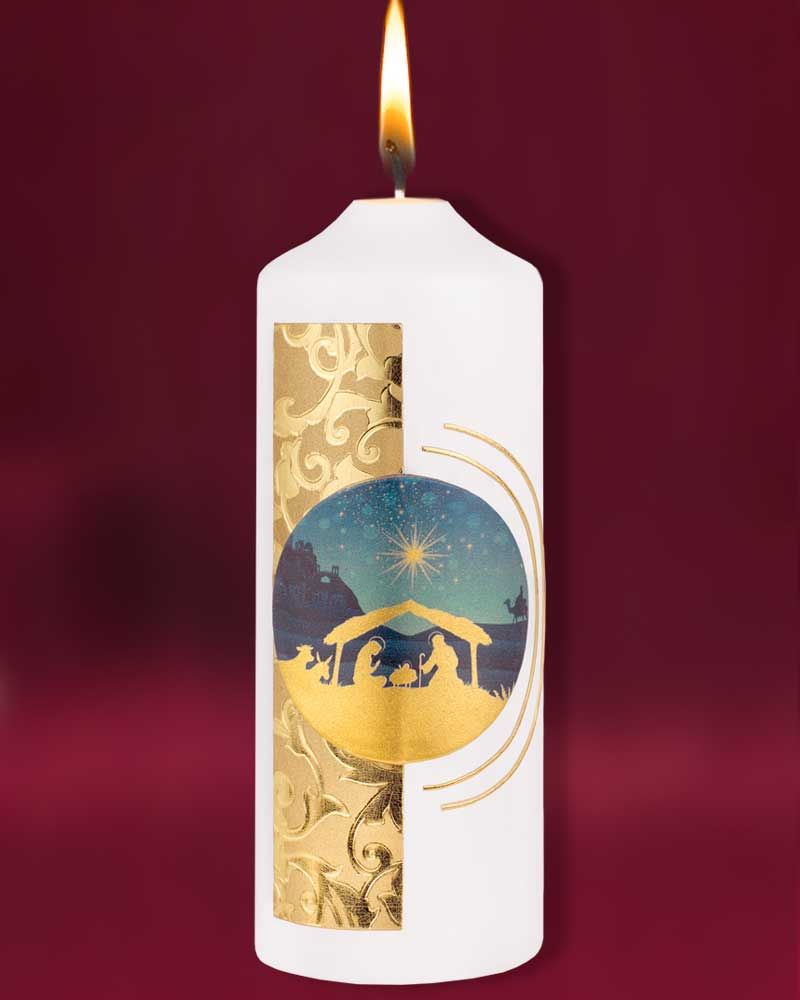 Weihnachtskerze 165x60mm Krippenmotiv Goldornament