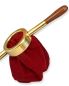 Klingelbeutel mit zwei Griffen, Messing poliert, in offener Ausführung, Samtsack dunkelrot mit verstärktem Innenfutter. Länge der Griffe: 17 cm, Lange des Beutels: 20 cm, Durchmesser der Öffnung: 8,5 cm.